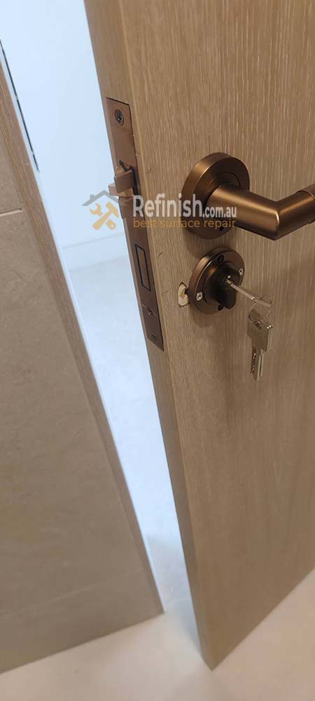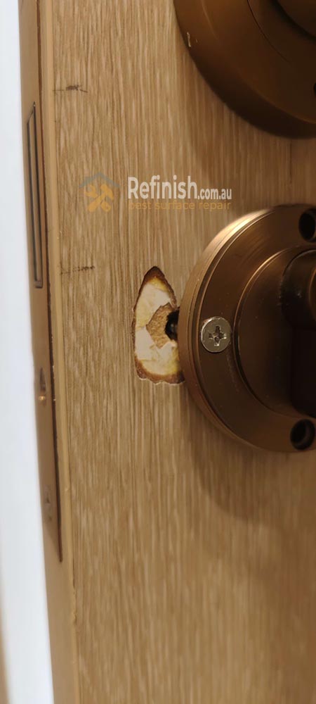 This was a high-stakes repair on a brand-new timber door. The builder required a restoration that was completely invisible and would be durable enough to withstand years of heavy use.